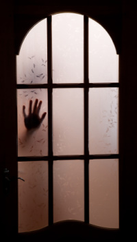 perempuan pakai baju hitam berdiri depan pintu, separuh badan kebawah